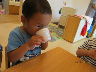 調理師さんがミキサーにバナナ、みかん、牛乳をいれる